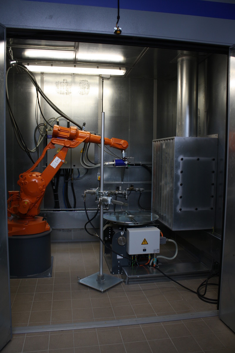 • The station is equipped with a Sulzer Metco plasma generator for spraying powders of metals, metal alloys and ceramics. The torch is placed on the arm of the ABB robot, model IRB 2400, which allows for precise determination and passage of the spray path. We are equipped with two burners model F4-MB-HBS and SM-F1. Deviations, parameters and calibration are carried out using a special stand, the so-called AcuraSpray equipped with a computer and a special camera. After calibration, the process is stable and repeatable.
