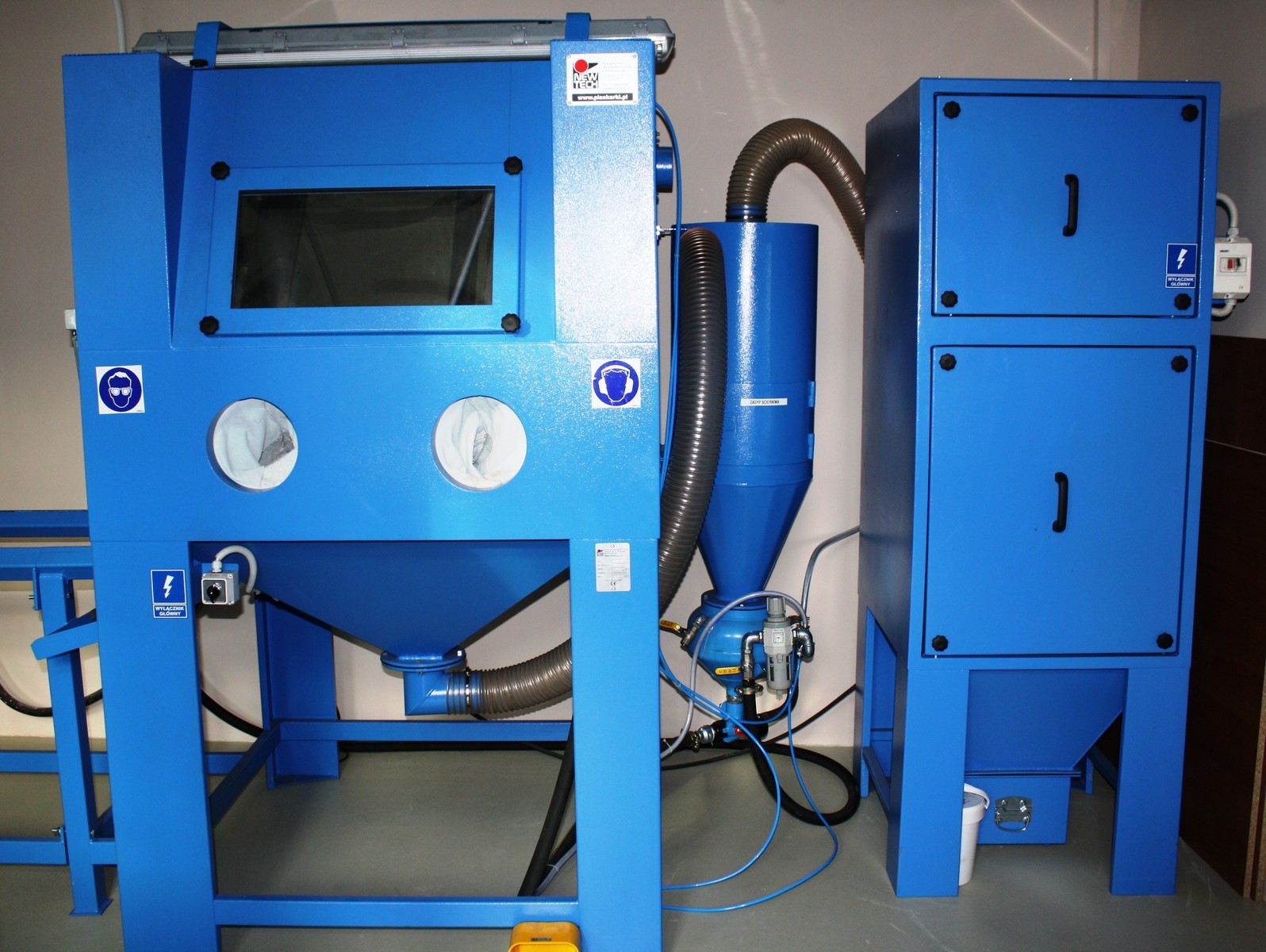 - Urządzenie do obróbki strumieniowo- ściernej przeznaczone jest do przygotowania powierzchni materiału przeznaczonego do natryskiwania plazmowego (APS). Kabina przystosowana jest do pracy z różnymi ścierniwami o granulacji 0,1 do 0,8 mm. Kabina posiada stół obrotowy, który wyjeżdża z sporych rozmiarów kabiny. Dzięki dużym wymiarom oraz stołowi obrotowemu możliwe jest umieszczenie dużych elementów.