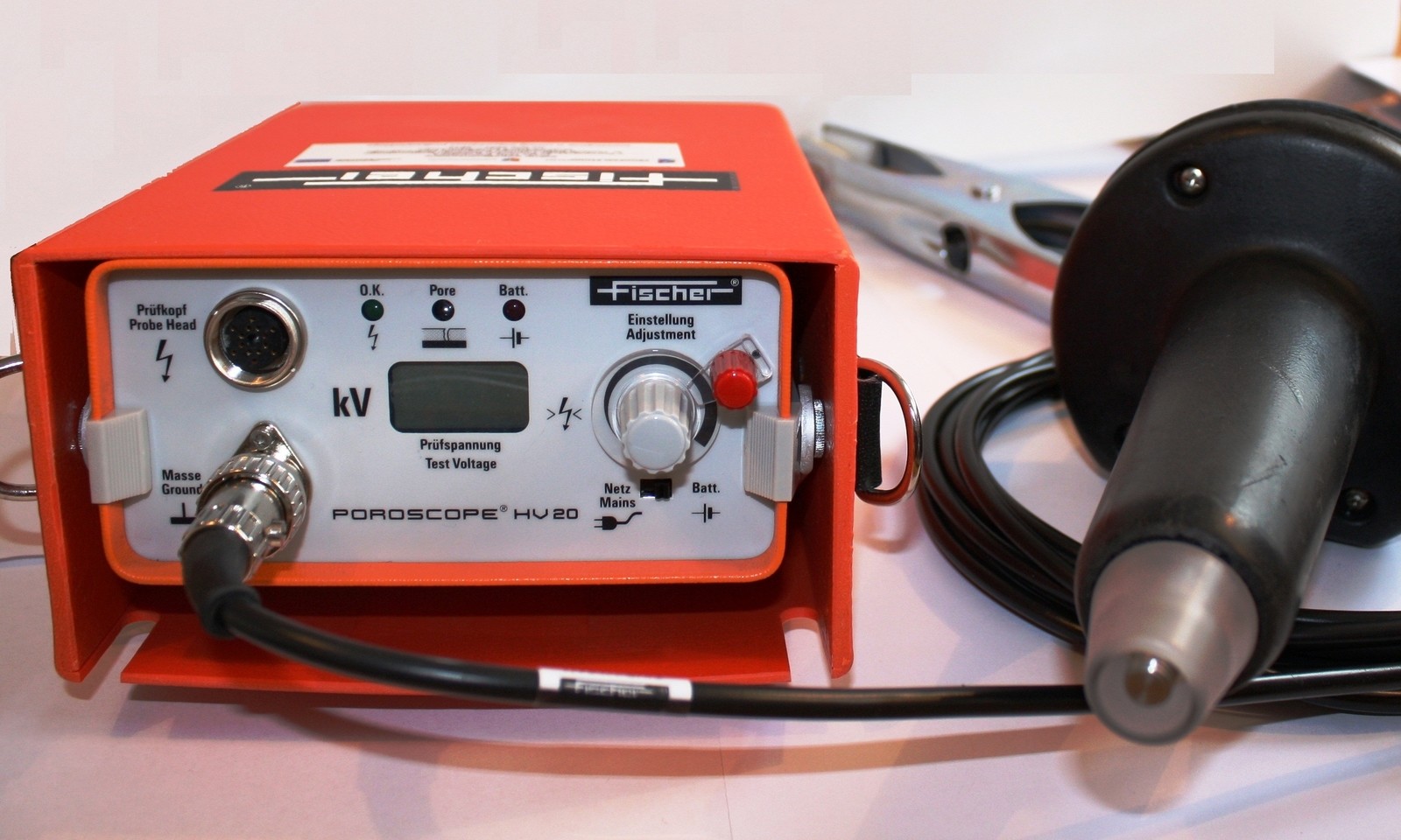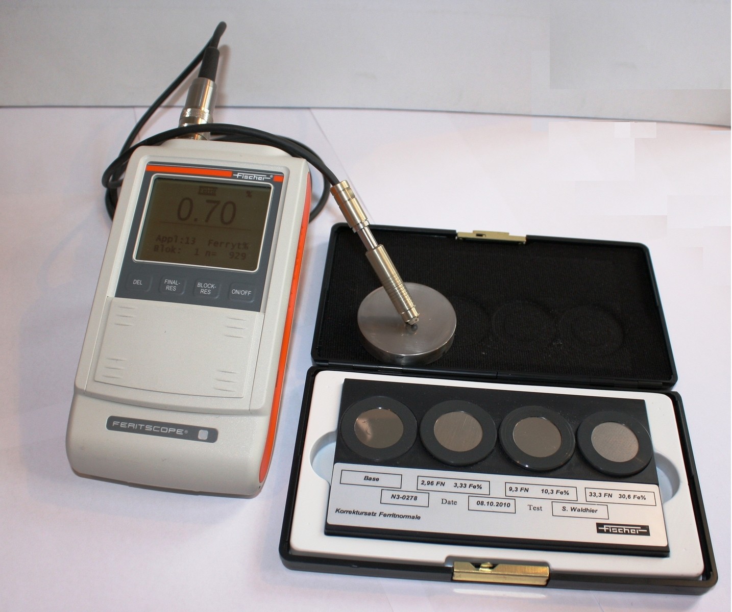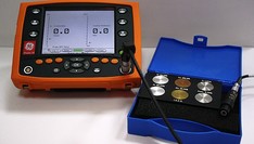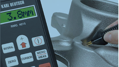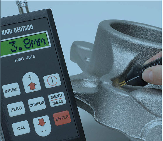 - Aparat pomiarowy RMG 4015 KARL DEUTSCH mierzy głębokość pęknięć w elementach z żelaza, stali oraz ze stali austenitycznej. Może być również wykorzystany do pomiarów pęknięć w miedzi, mosiądzu, aluminium i innych metalach niemagnetycznych. Zasada działania opiera się na sondzie potencjałowej. Sonda z czterema podpartymi na sprężynach, pozłacanymi pinami kontaktowymi jest umieszczana poprzecznie do pęknięcia w badanym materiale. Prąd przemienny przepływa pomiędzy dwoma pinami poprzez badany element. Pozostałe dwa piny mierzą spadek napięcia, na podstawie, którego szacowana jest głębokość pęknięcia. Urządzenie wykorzystuje napięcie przemienne i efekt naskórkowości, który zmusza prąd do płynięcia po powierzchni przewodnika i stąd podążania wzdłuż konturu pęknięcia. Działanie i mierzona wartość są monitorowane przez mikroprocesor urządzenia. Zakres pomiaru zawiera się od 0 do 99,9 mm.