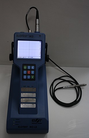 - Elotest M2. Urządzenie umożliwia wyszukiwanie pęknięć oraz ich identyfikację. Badanie odbywa się za pomocą odpowiednio dobranej głowicy wyskalowanej na wzorcu.